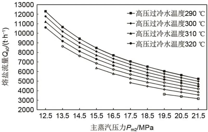 熔鹽儲熱為顯熱儲熱,在充熱功率和充熱時長確定的條件下,熔鹽使用量取決于熔鹽流量(Qs0)和熔鹽儲熱過程溫差(?T=Ts3-Ts1)。如前所述,受限于熔鹽安全使用溫度范圍,熔鹽儲熱過程冷熔鹽溫度(Ts1)設(shè)計為280 ℃,夾點溫差5 ℃,假定主蒸汽換熱后的溫度,即過冷高壓水溫度,和再熱蒸汽換熱后的溫度相同,即Tm4=Tr2。則熔鹽儲熱過程熱熔鹽溫度(Ts3)和熔鹽流量(Qs0)隨主蒸汽壓力(pm2)的變化關(guān)系分別如圖3和圖4所示。
