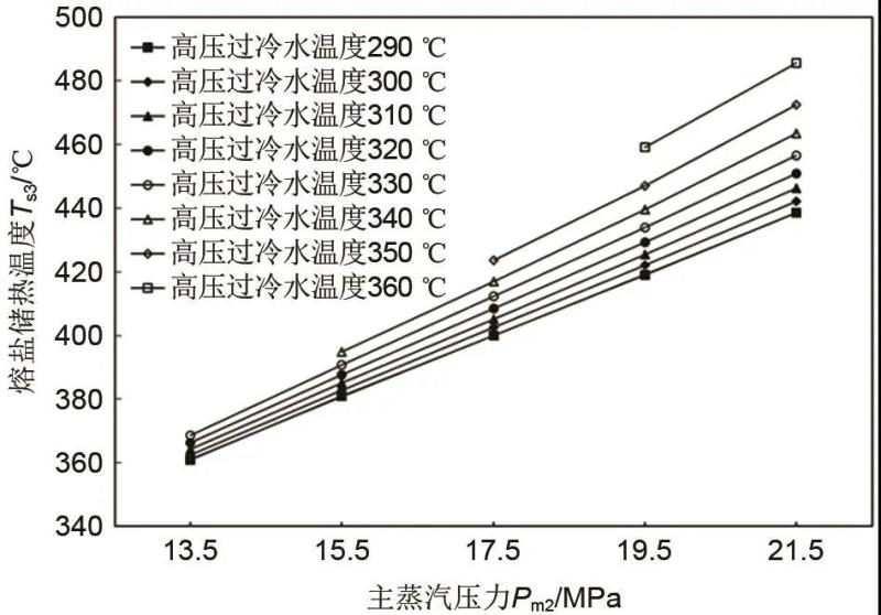 熔鹽儲熱過程熔鹽流量(Qs0)和熱熔鹽溫度(Ts3)隨過冷高壓水溫度(Tm4)的變化關(guān)系分別如圖5和圖6所示。由圖知,在相同主蒸汽壓力(pm2)條件下,熔鹽流量(Qs0)隨過冷高壓水溫度(Tm4)的增加近似呈線型減小的關(guān)系,熔鹽儲熱過程熱熔鹽溫度(Ts3)隨過冷高壓水的溫度(Tm4)增加呈加速增大的關(guān)系。由于過冷高壓水溫度(Tm4)的增大,其與凝結(jié)放熱溫差越小,在過冷換熱段釋放出更少的熱量,有助于減少在過冷加熱段的熔鹽流量(Qs0)。與此同時,熔鹽充熱熱量將被更高溫度的凝結(jié)換熱段和過熱換熱段占據(jù)更高比例,故熔鹽儲熱過程熱熔鹽溫度(Ts3)會逐漸增大。所以,儲熱系統(tǒng)設(shè)計較高的過冷高壓水溫度(Tm4),可提高熔鹽儲熱過程熱熔鹽溫度(Ts3)和減少熔鹽流量(Qs0)。