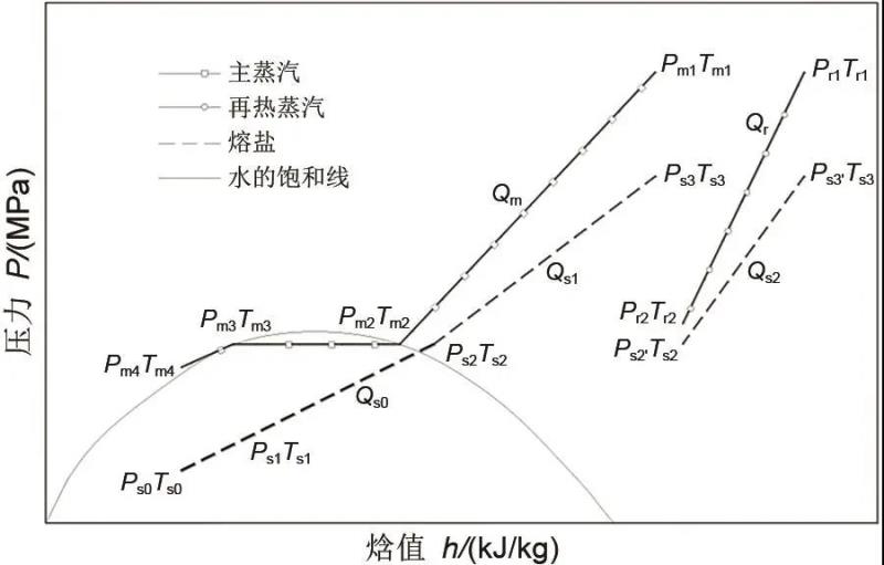 由圖2和熱質(zhì)平衡方程可知,儲熱換熱過程中,受限于熔鹽凝固溫度,主蒸汽和再熱蒸汽換熱后的溫度(Tm4、Tr2)不能低于凝固風(fēng)險溫度,主蒸汽和熔鹽換熱夾點溫差的上端溫度(Tm2)取決于主蒸汽壓力(pm2),熔鹽儲熱過程的熱熔鹽溫度(Ts3)取決于主蒸汽和再熱蒸汽的最高溫度(Tm1、Tr1)和熔鹽流量(Qs1、Qs2)。