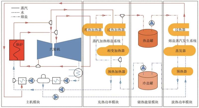 圖1 火電機組百兆瓦級熔鹽儲能工藝流程