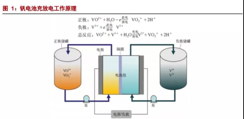 全釩液流電池,壽命長(zhǎng)、規(guī)模大、安全可靠。釩電池全稱(chēng)為全釩氧化還原液流電池(Vanadium Redox Battery,VRB),為液流電池的一種,是一種基于金屬釩元素的氧化還原的電池系統(tǒng),其電解液是不同價(jià)態(tài)的釩離子的硫酸電解液。根據(jù)電化學(xué)反應(yīng)中活性物質(zhì)的不同,液流電池可分為釩液流電池、鋅基液流電池、鐵鉻液流電池等。其中全釩液流電池,壽命長(zhǎng)、規(guī)模大、安全可靠的優(yōu)勢(shì)尤為突出,成為規(guī)模儲(chǔ)能的首選技術(shù),在調(diào)峰電源系統(tǒng)、大規(guī)模風(fēng)光電系統(tǒng)儲(chǔ)能、應(yīng)急電源系統(tǒng)等領(lǐng)域具有廣闊的應(yīng)用前景。