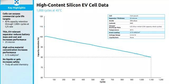 20層的小軟包電池在45°下的循環(huán)次數(shù)(C/5)超過(guò) 1,000 次循環(huán)( 80% 容量保持率),從數(shù)據(jù)來(lái)看,這個(gè)比QS的進(jìn)度要更好一些。