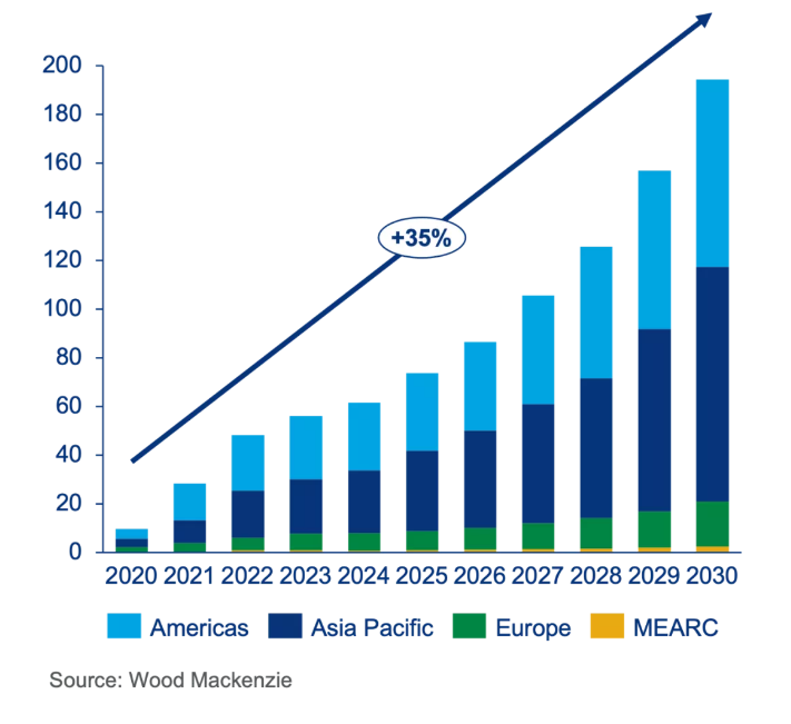 圖表:全球儲(chǔ)能部署容量預(yù)測(cè),2021-2030年