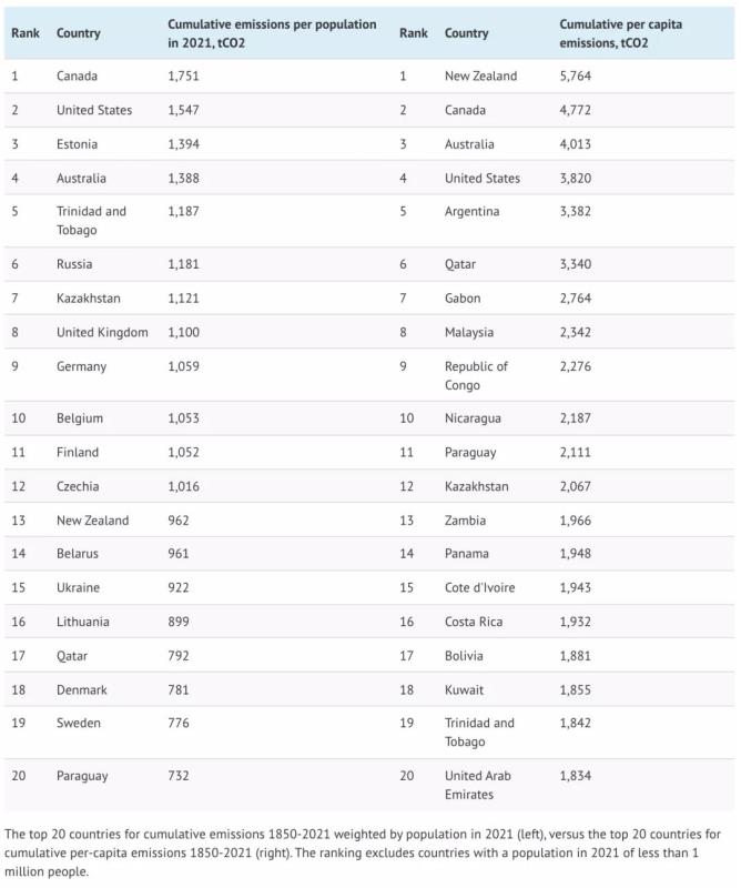 人均排放量高的小國對全球變暖相對不重要。因此,在計算人均累計排放量沒有包括目前人口低于100萬的國家(例如排除了盧森堡、圭亞那、伯利茲和文萊等國。)
