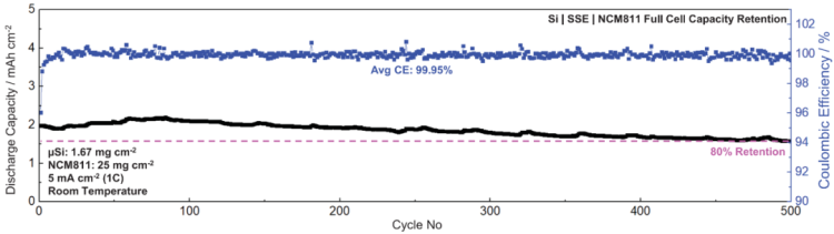 μSi陽(yáng)極在液態(tài)電解質(zhì)中的壽命很短,但是結(jié)合LiPSCl固態(tài)電解質(zhì)后集成的全固態(tài)電池,在5mA/cm2的電流密度下,經(jīng)過(guò)500次充放電循環(huán)后,仍能保持原始80%的容量。這其實(shí)已經(jīng)向前跨了一大步。