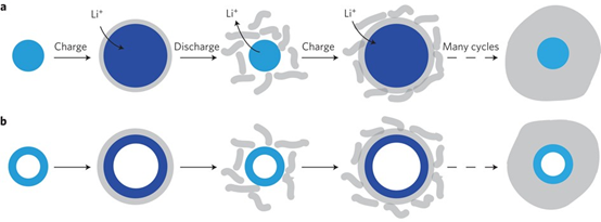 但是,Si作為陽(yáng)極存在一個(gè)致命的缺陷——它在完全嵌鋰的狀態(tài)下,其體積會(huì)膨脹到原有體積的300%。如果隨著充放電,Si陽(yáng)極連續(xù)地膨脹、收縮,最終整個(gè)陽(yáng)極會(huì)破碎甚至完全損壞。