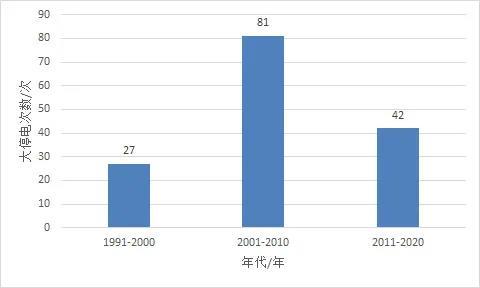 20世紀(jì)中期之后,全球電力工業(yè)進(jìn)入規(guī)??焖贁U(kuò)張階段,大面積停電事故對(duì)經(jīng)濟(jì)社會(huì)的影響越來越大,這緣于一方面電網(wǎng)互聯(lián)程度不斷加強(qiáng),單一事故波及范圍顯著擴(kuò)大;另一方面電氣化程度持續(xù)提高,大面積停電事故影響更為嚴(yán)重。綜合考慮大面積停電涉及負(fù)荷比例、影響用戶規(guī)模、停電持續(xù)時(shí)間、輿論關(guān)注度等因素,選取150次大停電事故進(jìn)行相關(guān)統(tǒng)計(jì)分析如下圖所示,從時(shí)間看,大多數(shù)事故發(fā)生于2000年之后,次數(shù)為125次,占比超過80%;分區(qū)域看,北美是停電事故頻發(fā)地區(qū),其中美國發(fā)生43次,加拿大發(fā)生6次,同時(shí)巴西、印度尼西亞等發(fā)展中國家也多次發(fā)生大面積停電事故。