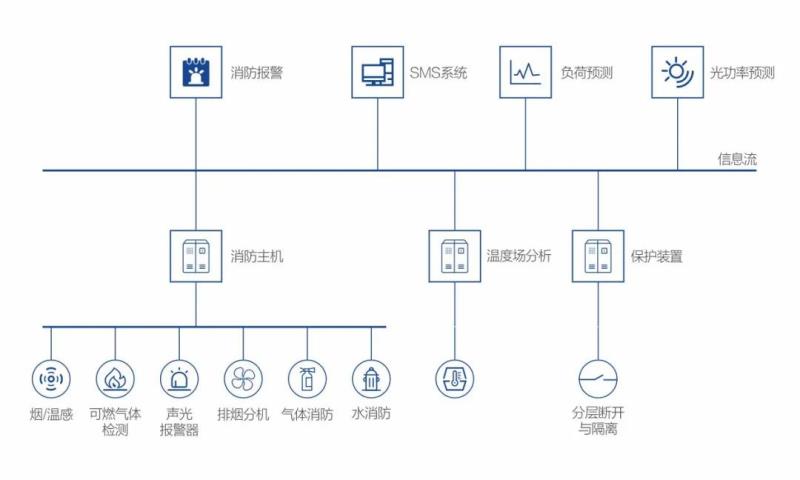 對于電力系統(tǒng)而言,儲能設(shè)備的安全可靠性是項目建設(shè)的第一宗旨。特變電工新能源在消防主機(jī)為核心的消防控制方案基礎(chǔ)上進(jìn)行了擴(kuò)展,通過設(shè)立專門的SMS安全管理系統(tǒng)(Security Management System),實時在線監(jiān)測儲能系統(tǒng)四級(電芯、電池模組、電池簇、集裝箱)熱管理,電芯參數(shù)AI大數(shù)據(jù)預(yù)測,實現(xiàn)電池安全狀態(tài)預(yù)判。在故障發(fā)生后,通過智能聯(lián)動功能,一方面分層斷開電路實現(xiàn)多層故障隔離,另一方面控制消防系統(tǒng)動作進(jìn)行聲光報警并釋放滅火介質(zhì),快速消除安全威脅,阻止故障的進(jìn)一步蔓延。
