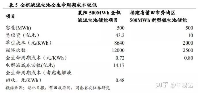 由于全釩液流電池的壽命長(zhǎng),充放電次數(shù)多,釩電池全生命周期成本較低,釩電池成本優(yōu)勢(shì)明顯。下面以襄陽(yáng)500MWh全釩液流電池儲(chǔ)能項(xiàng)目與福建省莆田市500MWh鋰電池儲(chǔ)能項(xiàng)目作為對(duì)比,不考慮電解液的回收,全釩液流電池全生命周期成本在0.72元/kwh,而鋰電池全生命周期成本在0.8元/kwh;若考慮電解液的回收,假設(shè)電解液成本占比41%且能夠80%回收,則釩電池的全生命周期成本為0.48元。隨著釩電池技術(shù)的進(jìn)步及規(guī)模化生產(chǎn),我們認(rèn)為釩電池電堆成本將持續(xù)下降,未來(lái)釩電池將會(huì)成本儲(chǔ)能的最佳選擇,推動(dòng)儲(chǔ)能達(dá)到經(jīng)濟(jì)性。