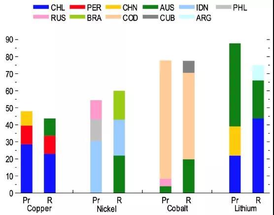金屬供應(yīng)相當(dāng)集中,這意味著少數(shù)主要生產(chǎn)商可能會(huì)從中受益。在大多數(shù)情況下,產(chǎn)量最大的國家擁有最高的儲(chǔ)量,因此很可能是潛在的生產(chǎn)國。例如,剛果民主共和國約占全球鈷產(chǎn)量的70% ,儲(chǔ)量的50% (圖4)。其他在產(chǎn)量和儲(chǔ)量方面突出的國家包括澳大利亞(鋰、鈷和鎳);智利(銅和鋰)以及少一些的秘魯、俄羅斯、印度尼西亞和南非。