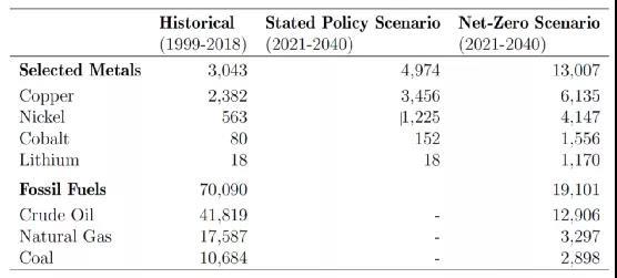 表1:2021-2040年某些能源轉(zhuǎn)型金屬全球生產(chǎn)的累計(jì)實(shí)際收入(十億美元)