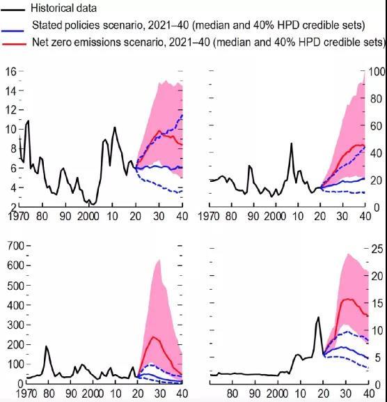 這四種金屬是能源轉(zhuǎn)型的潛在瓶頸。經(jīng)通脹調(diào)整后的金屬價(jià)格將達(dá)到與歷史峰值類似的水平,但在IEA的零排放情形中,這將是一個(gè)前所未有的持續(xù)時(shí)期,約為10年(圖3)。這意味著鎳、鈷和鋰的實(shí)際價(jià)格將從2020年的水平持續(xù)上漲數(shù)倍,而銅的價(jià)格將上漲超過60%。根據(jù)IEA的stated policy情景,實(shí)際油價(jià)將大致保持在2020年均值水平。