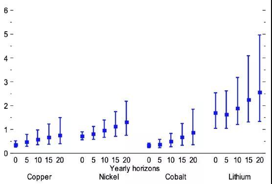 結(jié)果表明,供給在短期內(nèi)是非常缺乏彈性的,但在長(zhǎng)期內(nèi)更有彈性(圖2)。需求引起的價(jià)格上漲10%,使銅、鎳、鈷和鋰的產(chǎn)量分別增加3.5%、7.1%、3.2%和16.9%。20年后,同樣的價(jià)格沖擊使銅產(chǎn)量提高了7.5%,鎳產(chǎn)量提高了13%,鈷產(chǎn)量提高了8.6%,鋰產(chǎn)量提高了25.5%。