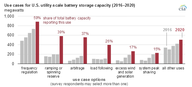 電池儲能系統(tǒng)最常見的用例是頻率響應(yīng)。頻率響應(yīng)是一種將電網(wǎng)頻率盡可能保持60Hz的服務(wù)。低于60Hz的偏差將會導(dǎo)致發(fā)電機保護性跳閘,從而導(dǎo)致電力系統(tǒng)穩(wěn)定性下降。電池儲能系統(tǒng)特別適用于頻率調(diào)節(jié),因為其電力輸出十分迅速,而且電池儲能系統(tǒng)可以快速吸收浪涌。到2020年底,美國總共有885MW的電池儲能系統(tǒng)(占公用事業(yè)規(guī)模電池儲能系統(tǒng)總裝機容量的59%)用于頻率響應(yīng)。