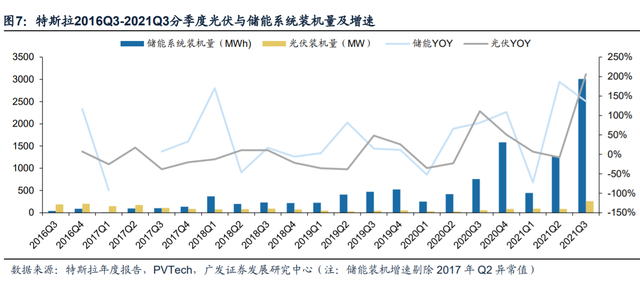 而統(tǒng)計數(shù)據(jù)一定程度上也佐證了這一發(fā)展方向。2015-2020年,特斯拉發(fā)電儲能業(yè)務(wù)收入復合增速達82.09%。今年Q1-Q3,特斯拉儲能裝機規(guī)模達4.73GWh,同比增長230.64%;光伏裝機量達437MW,同比增長267.23%,其中,Q3兩項裝機規(guī)模均創(chuàng)單季度新高。
