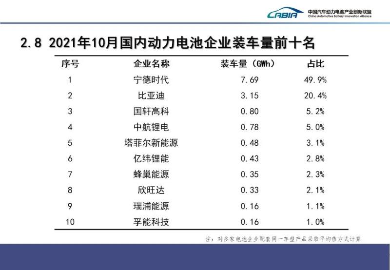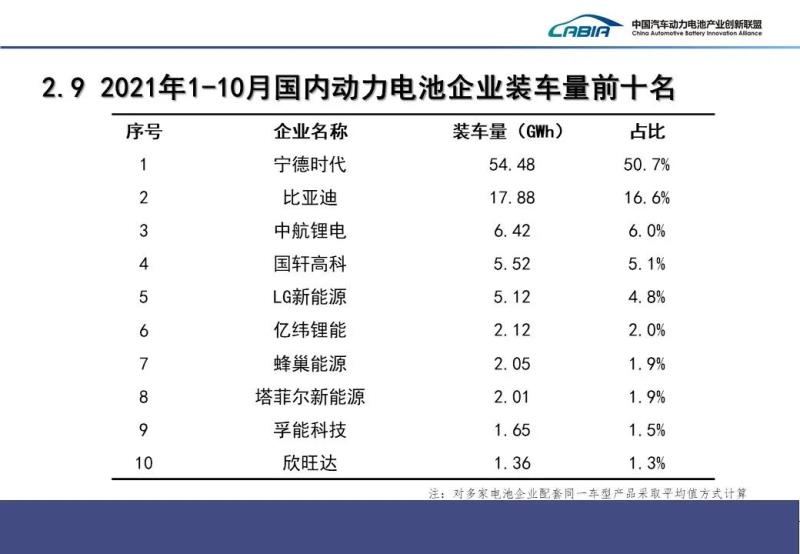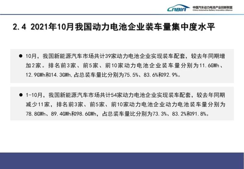 2021年10月,我國新能源汽車市場共計39家動力電池企業(yè)實現(xiàn)裝車配套,較去年同期增加2家。排名前3家、前5家、前10家動力電池企業(yè)裝車量分別為11.6GWh、12.9GWh和14.3GWh,占總裝車量比分別為75.5%、83.6%和92.9%。1-10月,我國新能源汽車市場共計54家動力電池企業(yè)實現(xiàn)裝車配套,較去年同期減少11家,排名前3家、前5家、前10家動力電池企業(yè)動力電池裝車量分別為78.8GWh、89.4GWh和98.6GWh,占總裝車量比分別為73.3%、83.2%和91.8%。