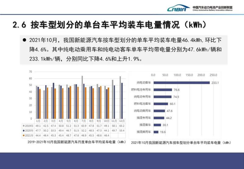 裝車量方面,2021年10月,我國動力電池裝車量15.4GWh,同比上升162.8%,環(huán)比下降1.8%。其中三元電池共計裝車7.0GWh,同比上升104.3%,環(huán)比上升13.5%;磷酸鐵鋰電池共計裝車8.4GWh,同比上升249.5%,環(huán)比下降11.6%。1-10月,我國動力電池裝車量累計107.5GWh,同比累計上升168.1%。其中三元電池裝車量累計54.1GWh,占總裝車量50.3%,同比累計上升100.1%;磷酸鐵鋰電池裝車量累計53.2GWh,占總裝車量49.5%,同比累計上升316.4%。