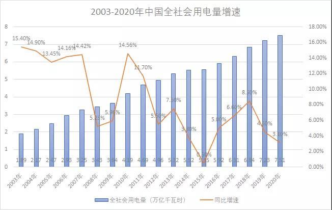 從社會需求看,過去十年全社會用電量同樣保持持續(xù)增長態(tài)勢。即便是疫情肆虐的2020年,全社會用電量依然實現(xiàn)3.1%的增速,達(dá)到創(chuàng)紀(jì)錄的7.51萬億千瓦時。