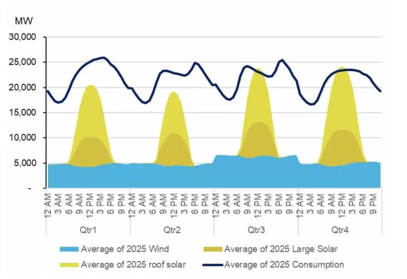 它表明,到 2025 年,風(fēng)能和太陽能的總產(chǎn)量有望在一年中的第 3 季度和第 4 季度的中午超過幾個(gè)小時(shí)的總電力需求。