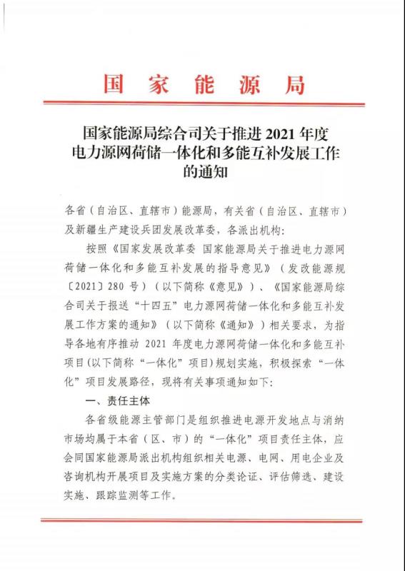 中國儲能網(wǎng)訊:11月10日,國家能源局綜合司下發(fā)《關(guān)于推進(jìn)2021年度電力源網(wǎng)荷儲一體化和多能互補發(fā)展工作的通知》。其中,鼓勵重大創(chuàng)新示范。各省級能源主管部門應(yīng)在確保安全的前提下,以需求為導(dǎo)向,優(yōu)先考慮含光熱發(fā)電,氫能輸儲用,梯級電站儲能、抽水蓄能、電化學(xué)儲能、壓縮空氣儲能、飛輪儲能等新型儲能示范的“一體化”項目。積極鼓勵“一體化”項目在規(guī)劃、建設(shè)、運行各個階段實現(xiàn)統(tǒng)籌管理,充分發(fā)揮虛擬電廠調(diào)節(jié)作用,積極推進(jìn)一體化智慧聯(lián)合調(diào)控,系統(tǒng)集成管理體制和商業(yè)模式