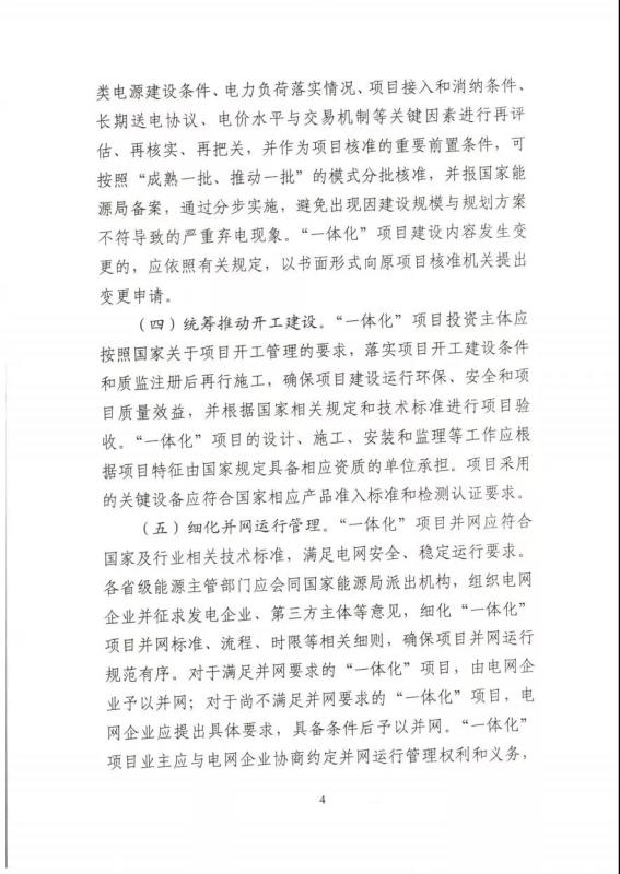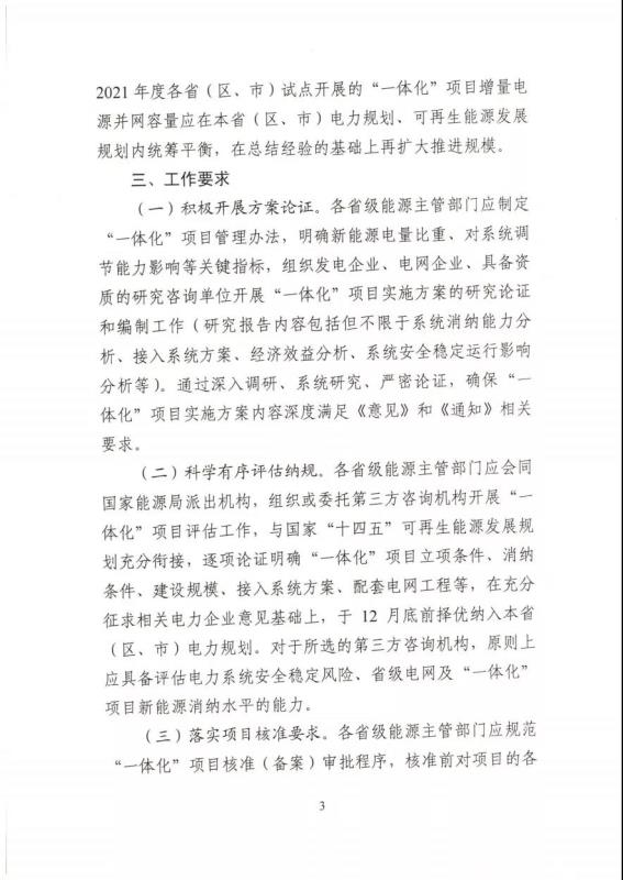 《通知》表示,各省級能源主管部門應(yīng)開展“一體化”項目評估工作,與國家“十四五”可再生能源發(fā)展規(guī)劃充分銜接,逐項論證明確“一體化”項目立項條件、消納 條件、建設(shè)規(guī)模、接入系統(tǒng)方案、配套電網(wǎng)工程等,在充分 征求相關(guān)電力企業(yè)意見基礎(chǔ)上,于 12 月底前擇優(yōu)納入本?。▍^(qū)、市)電力規(guī)劃。