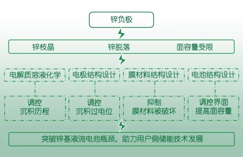 針對(duì)鋅負(fù)極存在的鋅枝晶、鋅脫落、面容量受限等主要問(wèn)題:從電解質(zhì)溶液化學(xué)的角度入手,可以調(diào)控鋅沉積歷程;從電極結(jié)構(gòu)設(shè)計(jì)角度切入,可以調(diào)控鋅沉積過(guò)電位;從膜材料結(jié)構(gòu)角度來(lái)設(shè)計(jì),可以抑制金屬鋅對(duì)其造成的破壞;從電池結(jié)構(gòu)角度進(jìn)行優(yōu)化,可以調(diào)控膜與電極界面空間,提高鋅基液流電池面容量。最終突破鋅基液流電池的“瓶頸”,助力用戶側(cè)儲(chǔ)能技術(shù)的發(fā)展。