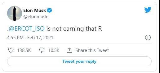 特斯拉CEO埃隆·馬斯克(Elon Musk)當(dāng)時(shí)在推特上批評得州的電力運(yùn)營商“沒有R”——R是得州電力可靠性委員會(huì)(Electric Reliability Council of Texas)中Reliability的縮寫,意指得州電網(wǎng)供電可靠性不足。馬斯克本人在2020年12月從加州搬到了得州,并且陸續(xù)將很多業(yè)務(wù)也搬到得州,包括在得州首府奧斯汀附近建設(shè)新的特斯拉超級工廠,在博卡奇卡建設(shè)SpaceX發(fā)射場。