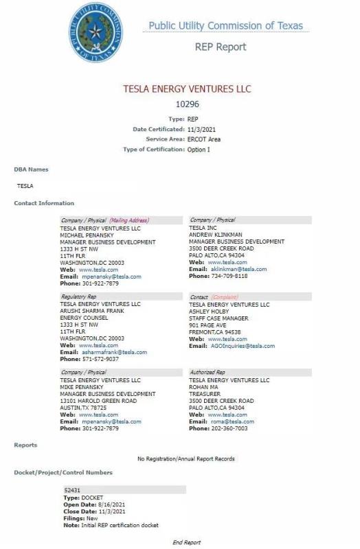 特斯拉的全資子公司——特斯拉能源風(fēng)險(xiǎn)投資公司(Tesla Energy Ventures)在2021年8月中旬向美國得州公用事業(yè)委員會(huì)(Public Utility Commission of Texas)提交了在該州銷售電力的申請。11月初,得州公用事業(yè)委員會(huì)批準(zhǔn)了特斯拉的運(yùn)營申請。得州公用事業(yè)委員會(huì)的網(wǎng)站顯示,特斯拉能源風(fēng)險(xiǎn)投資公司現(xiàn)在被許可在ERCOT(得州電力可靠性委員會(huì))服務(wù)的整個(gè)地區(qū)提供零售電力服務(wù)。