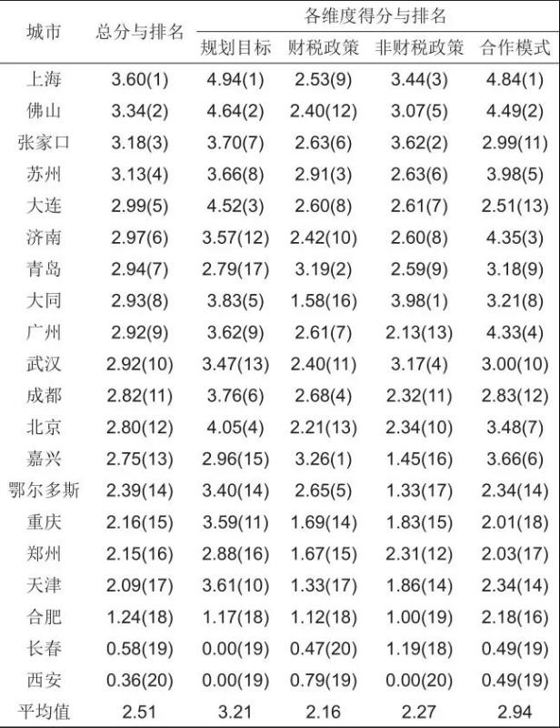 表5 20個城市燃料電池汽車政策準(zhǔn)備度及其分維度得分與排名