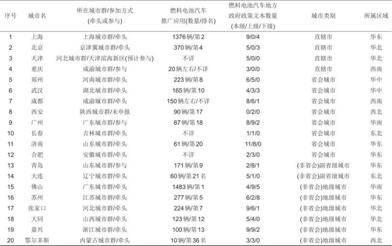 表3中列舉的20個城市,包括4個直轄市、8個省會城市和8個非省會城市,分布在全國全部七大區(qū)域(華北4個、華東6個、華南2個、華中2個、東北2個、西北2個、西南2個)的18個省份。從在一定程度上反映政策效果的市場化水平看,在燃料電池汽車推廣應(yīng)用數(shù)量列全國前十位的城市中,有2個推廣數(shù)量較高的城市(深圳和濰坊)未被選入。深圳未選入的原因主要為,該市雖曾出現(xiàn)過短期的氫燃料電池物流車推廣熱潮,2019年其累計推廣數(shù)量即已位居全國城市總推廣量前三(高達(dá)774輛),但因當(dāng)?shù)責(zé)o加氫條件,這些車輛實(shí)際大多未在深圳運(yùn)營;從產(chǎn)業(yè)基礎(chǔ)看,深圳以發(fā)展電動汽車為主,近年來未出臺過燃料電池汽車支持政策,2019年后當(dāng)?shù)匾酂o新增燃料電池車輛推廣。與深圳未選入的原因不同,濰坊的推廣應(yīng)用總量高于同在山東城市群的青島和濟(jì)南,出臺的政策數(shù)量也不少,但考慮到青島為副省級城市,在2021年上半年全國637輛燃料電池汽車使用涉及的22個城市中,青島的推廣應(yīng)用量從2020年上半年的第八位躍居為第一位(191輛),且遠(yuǎn)高于其他城市,因此對于山東城市群,除牽頭城市濟(jì)南外,也把青島選入進(jìn)行評價。增選的其他幾個城市中,天津、重慶為近年來在加快發(fā)展燃料電池汽車的直轄市;廣州為近年來加快布局燃料電池汽車的省會城市;西安所在的陜西城市群雖尚未申報,但西安是燃料電池汽車接入量位居全國所有城市第17位的省會城市,在燃料電池汽車政策和市場發(fā)展相對較為薄弱的西北地區(qū),有一定代表性。