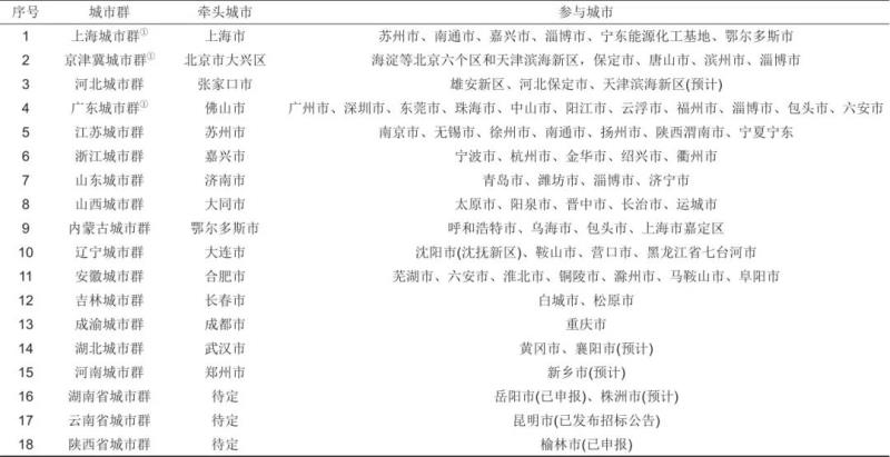 ①:上海城市群、京津冀城市群、廣東城市群于2021年8月被國家五部委(財政部、工業(yè)和信息化部、科技部、國家改革發(fā)展委、國家能源局)批準(zhǔn)為首批燃料電池汽車示范城市群,表中為這三個城市群的牽頭及參與城市為國家實(shí)際批準(zhǔn)的城市。