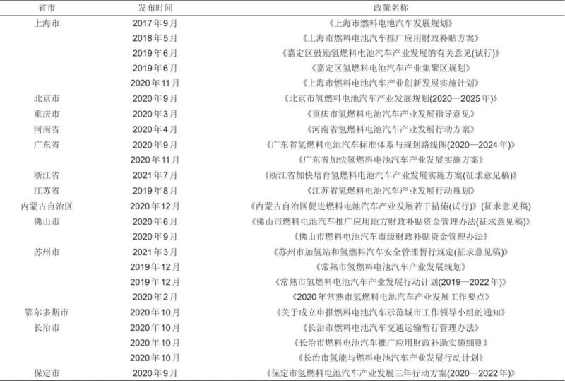 表3 20個典型城市燃料電池汽車推廣應(yīng)用及政策出臺情況(2018年至2021年6月)