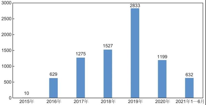 圖1 2015年至2021年6月中國燃料電池汽車年產(chǎn)量情況(單位:輛)