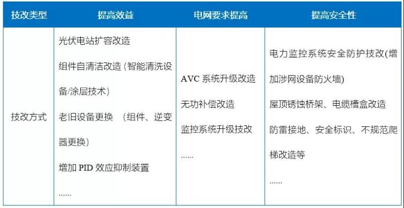 光伏電站的技改,根據(jù)目的不同,大致可以分為三類,如下表所示。
