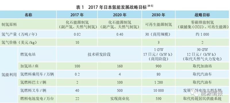日本在全球氫能產(chǎn)業(yè)發(fā)展中表現(xiàn)突出,國家政策導向明確,氫能產(chǎn)業(yè)已成體系。近年來日本陸續(xù)提出明確的氫能戰(zhàn)略和發(fā)展路線圖。2013年,推出《日本再復興戰(zhàn)略》,提升氫能源發(fā)展為國策。2014年,在第四期《能源基本計劃》中,將氫能源定位為與電力和熱能并列的二次核心能源,并提出建設(shè)“氫能社會”的愿景。同年,對外公布的《氫能/燃料電池戰(zhàn)略發(fā)展路線圖》中,詳細描述了氫能源研發(fā)推廣的三大階段以及每個階段的戰(zhàn)略目標。2017年,發(fā)布了《氫能源基本戰(zhàn)略》(見表1),為全球首例,提出了2050年愿景和2030年行動計劃,在氫能供應(yīng)和氫能利用方面提出了詳細的目標。