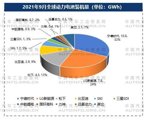 SNE Research發(fā)布的數(shù)據(jù)顯示,2021年9月,全球電動車電池裝機(jī)量約為32.9 GWh,同比增長近一倍(94%)。在9月全球動力電池裝機(jī)量Top 10榜單中,中國有六家電池制造商上榜,分別是寧德時代、比亞迪、中航鋰電、國軒高科、力神和遠(yuǎn)景動力,占總市場份額的48%。其中,寧德時代仍居榜首,力神擠掉了蜂巢能源,位列第9。