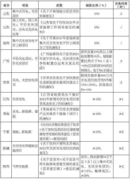 7月14日,寧夏回族自治區(qū)發(fā)展改革委發(fā)布《關(guān)于加快促進儲能健康有序發(fā)展的通知》,明確配置原則:新能源項目儲能配置比例不低于10%、連續(xù)儲能時長2小時以上,從2021年起,原則上新核準(zhǔn)/備案項目儲能設(shè)施與新能源項目同步投運,存量項目在2022年12月底前完成儲能設(shè)施投運,對于達到以上要求的儲能項目,支持參與電力輔助服務(wù)市場。該項政策為儲能行業(yè)的發(fā)展創(chuàng)造有利條件。湖北省能源局印發(fā)《2021年平價新能源項目開發(fā)有關(guān)事項的通知》,提出將優(yōu)先支持源網(wǎng)荷儲和多能互補百萬千瓦基地等新能源項目建設(shè),對于可配置規(guī)模小于基地規(guī)模(1吉瓦)的按照容量的10%、2小時以上、充放電6000次以上的標(biāo)準(zhǔn)配置儲能。山西省要求,首批試點示范項目儲能規(guī)??偭?0萬~100萬千瓦。其中,獨立儲能單體項目額定功率不低于1萬千瓦,參與調(diào)峰的項目額定功率下連續(xù)充放電時間原則上不低于2小時,參與調(diào)頻的項目額定功率下連續(xù)充放電時間原則上不低于15分鐘。其他形式儲能電站,按照“一事一議”原則確定等等相關(guān)政策,推動儲能發(fā)展,表2為各省份對儲能比例、充電時間要求的匯總表。