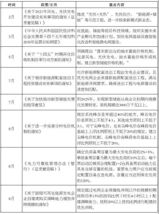 表1 2021年儲能政策匯總