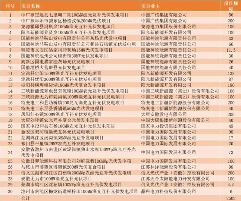 中國儲能網(wǎng)訊:11月19日,安徽省能源局下發(fā)了《安徽省2021年光伏發(fā)電項(xiàng)目競爭性配置(第二批次)中選公告》和《安徽省2021年風(fēng)電項(xiàng)目競爭性配置(第二批次)中選公告》,其中,光伏30個項(xiàng)目總規(guī)模為2502MW;風(fēng)電6個項(xiàng)目總規(guī)模為1166MW。