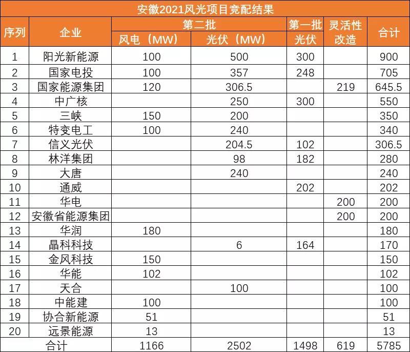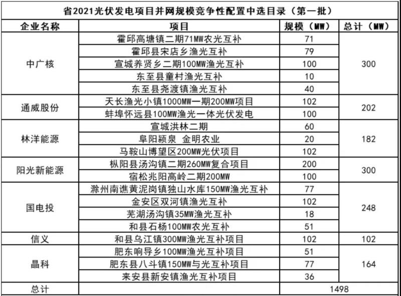 此前10月21日,安徽省能源局下發(fā)《2021年光伏發(fā)電項(xiàng)目并網(wǎng)規(guī)模競爭性配置(第一批次)中選公告》,規(guī)模共計(jì)1498MW。中廣核、陽光新能源、國家電投、通威、林洋、晶科、信義光能等7家企業(yè)中標(biāo)20個光伏第一批優(yōu)選項(xiàng)目。加上此次安徽省總共公示了4GW光伏、1.166GW風(fēng)電項(xiàng)目。
