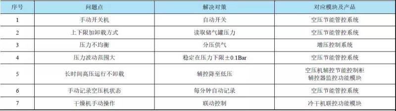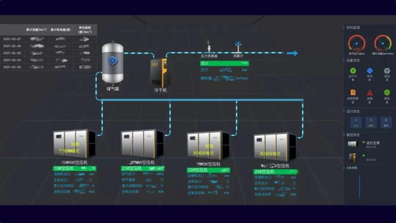 該項(xiàng)目實(shí)現(xiàn)了系統(tǒng)無(wú)人值守監(jiān)視控制管理、能效數(shù)據(jù)采集、自動(dòng)抄表、自學(xué)習(xí)精準(zhǔn)計(jì)算系統(tǒng)效率、無(wú)限尋優(yōu)、自動(dòng)預(yù)警、提高系統(tǒng)綜合能效,根據(jù)負(fù)荷需求供給壓縮空氣、持續(xù)節(jié)能、節(jié)能空間可視化等。而其主要的方案亦是配置數(shù)字化的管控系統(tǒng)。