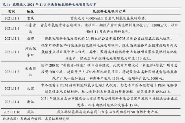 行業(yè)參與者逐步發(fā)力,氫燃料電池項目及訂單提速。2020年由于疫情和政策預期的影響,行業(yè)產(chǎn)出節(jié)奏放緩。但今年隨著政策的落地,相關產(chǎn)業(yè)鏈,特別是燃料電池車產(chǎn)業(yè)鏈,訂單顯著增加。進入11月以來,武漢、浙江、成都、山東淄博、武漢、石家莊等地陸續(xù)新增氫能客車采購訂單。