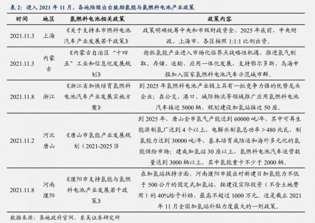 各地陸續(xù)出臺發(fā)展氫能與氫燃料電池產(chǎn)業(yè)規(guī)劃和地方補貼。據(jù)媒體報道,在“雙碳”目標下,我國氫能產(chǎn)業(yè)發(fā)展正步入快車道,已有50多個地級市發(fā)布氫能產(chǎn)業(yè)規(guī)劃。據(jù)不完全統(tǒng)計,北京、河北、四川、山東、內(nèi)蒙古等地出臺了專項氫能整體產(chǎn)業(yè)發(fā)展政策。