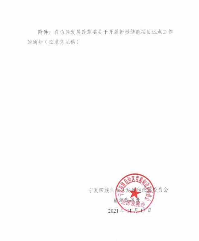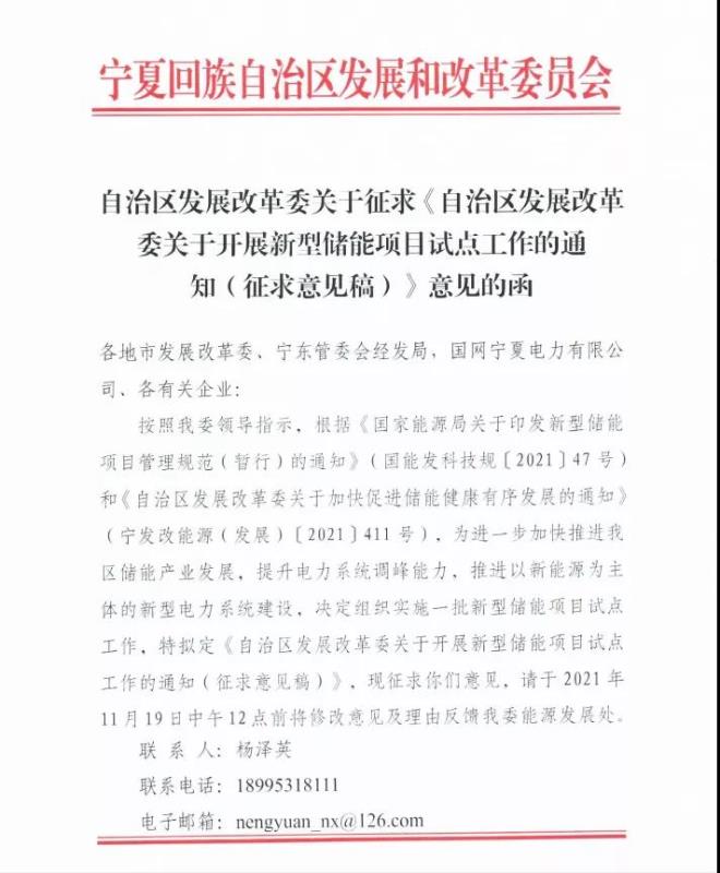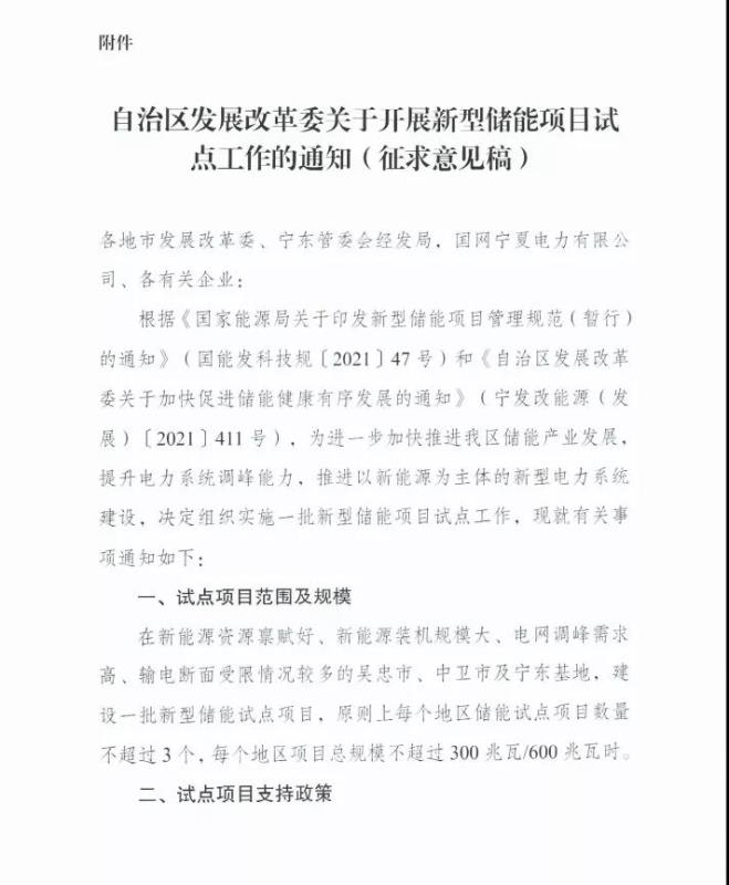 中國儲能網(wǎng)訊:11月17日,寧夏回族自治區(qū)發(fā)展和改革委員會發(fā)布關于開展新型儲能項目試點工作的通知(征求意見稿),根據(jù)意見稿,在新能源資源稟賦好、新能源裝機規(guī)模大、電網(wǎng)調峰需求高、輸電斷面受限情況較多的吳忠市、中衛(wèi)市及寧東基地,建設一批新型儲能試點項目,原則上每個地區(qū)儲能試點項目數(shù)量不超過3個,每個地區(qū)項目總規(guī)模不超過300兆瓦/600兆瓦時。