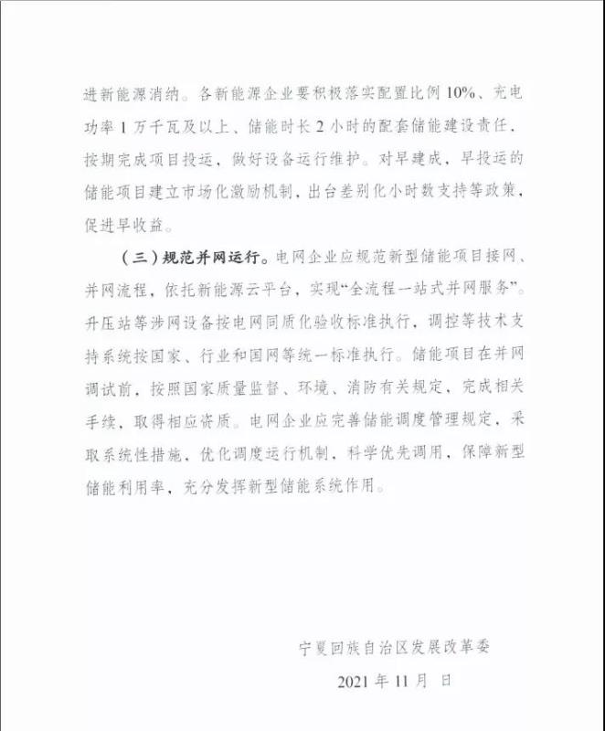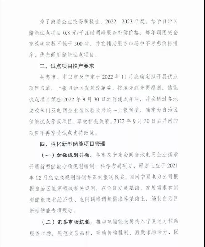 試點項目投產要求:吳忠市、中衛(wèi)市及寧東于2022年11月底確定擬開展試點項目名單,上報自治區(qū)發(fā)展改革委。按照先到先得原則,儲能試點項目須在2022年9月30日之前建成并網(wǎng),并在通過各地發(fā)改部門及電網(wǎng)企業(yè)組織驗收后同意上報我委,確定為自治區(qū)儲能試點示范項目,享受相關政策。2022年9月30日后并網(wǎng)的項目不再享受試點支持政策。