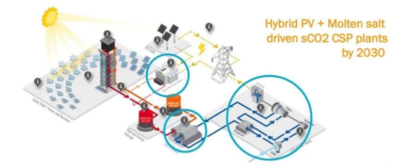 實際上“電-熱-電”技術(shù)已經(jīng)被國外很多科研技術(shù)人員采納,例如歐盟2020年10月新推出的SOLARSCO?OL計劃,決定采用光伏電站與光熱發(fā)電互補,通過電加熱為儲熱罐熔鹽補熱,動力系統(tǒng)計劃采用超臨界二氧化碳發(fā)電技術(shù),效率提高至50%以上。該計劃動靜不小,歐盟資助該項目約1000萬歐元,由來自6個歐盟國家(意大利,西班牙,德國,希臘,比利時,瑞典)和1個歐盟外國家(摩洛哥)的15個國際企業(yè)組成項目聯(lián)盟來實施;旨在致力于開發(fā)一種具有創(chuàng)新性,經(jīng)濟上可行且易于復(fù)制的超臨界CO?電站,再加上快速反應(yīng)的電加熱器和高效熱交換器,帶來全新的電站布局設(shè)計和運行理念。如圖3所示: