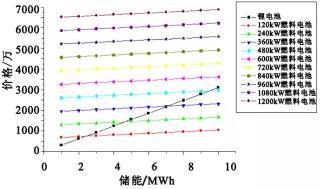 鋰電池作為儲(chǔ)能裝置,單位儲(chǔ)能價(jià)格比較穩(wěn)定,故而總儲(chǔ)能花費(fèi)價(jià)格與儲(chǔ)能量成正比關(guān)系。燃料電池的儲(chǔ)能量也與儲(chǔ)存燃料成正相關(guān),不過相比于鋰電池,燃料電池的成本主要消耗在電堆系統(tǒng)制造上,燃料及其燃料儲(chǔ)存花費(fèi)占比不大,從圖5中可以看到,其總花費(fèi)不會(huì)隨著儲(chǔ)能量的增加而顯著增加。另外,當(dāng)總儲(chǔ)能一定的條件下,增加功率基本不會(huì)影響鋰電池的總成本,但會(huì)顯著增加燃料電池的成本,這是因?yàn)槿剂想姵氐妮敵龉β逝c電堆系統(tǒng)大小有關(guān),而電堆制造占燃料電池總成本的70%以上。