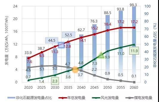 發(fā)電量方面,2030-2035年間非化石能源年發(fā)電量超過50%,形成非化石能源發(fā)電為主體的電力系統(tǒng);風(fēng)光發(fā)電量快速提升是非化石能源發(fā)電量占比提高的主要原因,2030年風(fēng)光發(fā)電量達(dá)到2.3萬億千瓦時(shí),占總發(fā)電量20%;2035-2040年間風(fēng)光發(fā)電量開始超過煤電,之后煤電進(jìn)一步加速退役,風(fēng)光發(fā)電量在總發(fā)電量中占比加速提高,2045-2050年間超過50%,成為發(fā)電主體;2060年風(fēng)光發(fā)電量11.9萬億千瓦時(shí),占總發(fā)電量69.2%,為構(gòu)建以新能源為主體的新型電力系統(tǒng)創(chuàng)造必要條件。