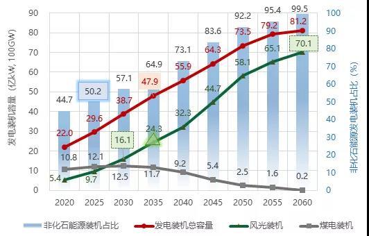 電力裝機(jī)方面,隨著風(fēng)光等新能源發(fā)電快速發(fā)展,非化石能源發(fā)電在電力裝機(jī)總量中的占比持續(xù)提高,“十四五”末將超過50%。風(fēng)光發(fā)電裝機(jī)不斷增加,2025-2030年間,風(fēng)光裝機(jī)總量超過煤電,2030年將達(dá)到16.1億千瓦,占裝機(jī)總量41.5%;2035年達(dá)到24.3億千瓦,超過電力裝機(jī)總量的50%,成為裝機(jī)主體;2060年達(dá)到70.1億千瓦,在電力裝機(jī)總量中的占比超過85%。