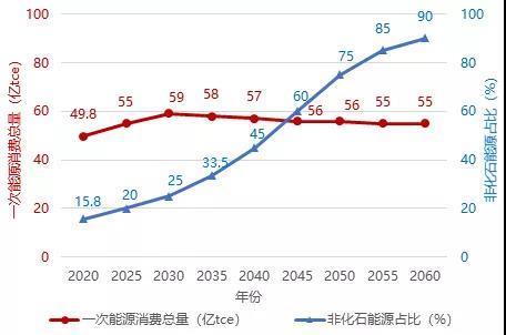 圖1 2020-2060年我國一次能源消費(fèi)總量及非化石能源占比
